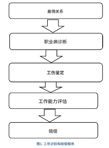 尘肺病作为一种常见职业病,在现行法律框架下被明确认定为工伤。患有尘肺病的矿工依法有权获得相应赔偿。然而,要获得工伤保险赔偿,矿工需经历一套程序化流程,主要包括五个关键阶段(见图1):(1)确认劳动关系;(2)由官方卫生机构进行职业病诊断;(3)由当地人力资源和社会保障部门进行工伤认定;(4)劳动能力及伤残等级鉴定;(5)赔偿金额的计算。